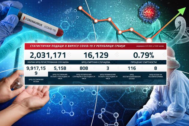 U poslednja 24 sata registrovano je 808 slučaja zaraze korona virusom od testiranih 5.158 uzoraka.