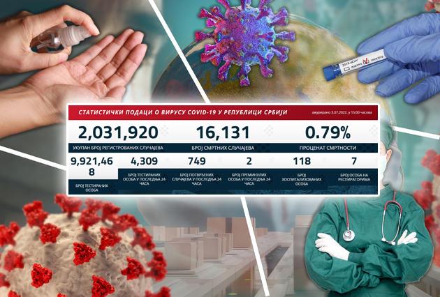 U poslednja 24 sata registrovano je 749 slučaja zaraze korona virusom od testiranih 4.309 uzoraka.