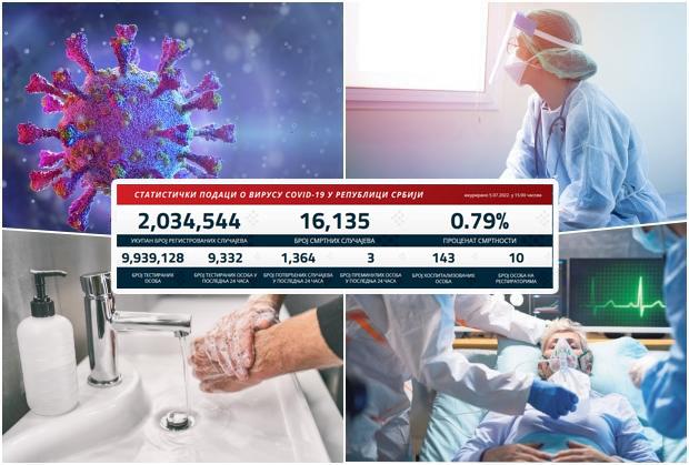 U poslednja 24 sata kovid je potvrđen kod 1.364 osobe od 9.332 testirana građana.