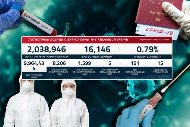 Korona virus je u poslednja 24 sata potvrđen kod 1.599 osoba, a istovremeno je od posledica kovida preminulo pet pacijenata, pokazuje najnoviji korona presek.
