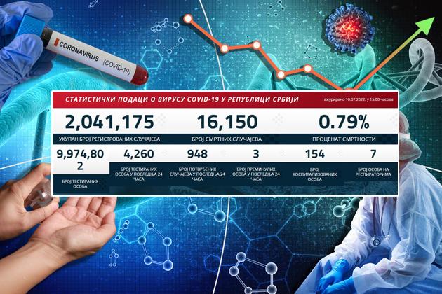 BEOGRAD - U Srbiji su u poslednja 24 sata registrovana nova 948 slučaja korona virusa, među 4.260 testiranih uzoraka.