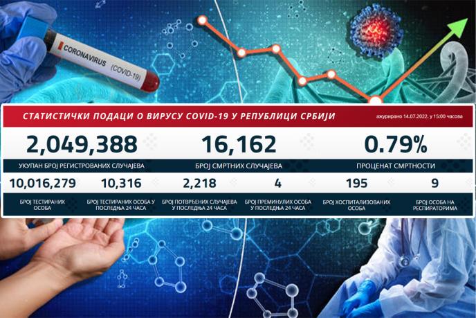 U Srbiji je u poslednja 24 sata registrovano 2.218 novih slučajeva korona virusa od testiranih 10.316 uzoraka. Od posledica ove infekcije preminule su 4 osobe.