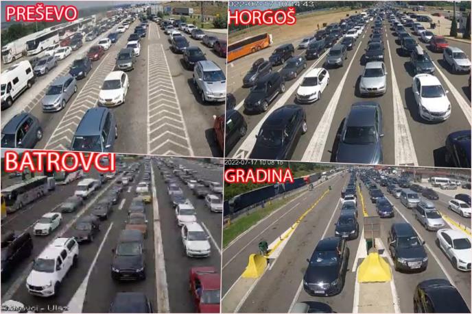 Prema informacijama Uprave granične policije, dobijenim u 05.15 časova, na Gradini na izlasku čeka se 100 minuta, a na Horgošsu na ulasku u zemlju jedan sat.