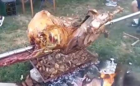 Na društvenim mrežama pojavio se snimak noja na ražnju. Kako se može čuti, ptica je imala 150 kilograma žive vage.