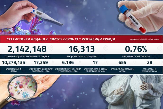U Srbiji je u prethodna 24 sata registrovano 6.196 slučajeva zaraze koronavirusom od 17.259 testiranih uzoraka.