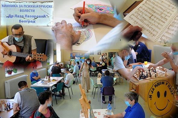 Prostrano zeleno dvorište, debela hladovina među zgradama, cvrkut ptica... Poveća grupa muškaraca s maskama na licu uredno izlazi u šetnju. Nisu ni stari, mahom. Pred zgradom, na čijem ulazu je letnjikovac, dočekuje nas psihijatar dr Goran Đinđić, pomoćnik direktora "Laze". A unutra zidovi na svakom koraku prekriveni slikama. Zanimljivim, lepim... U dnu sale pano sa smajlijem "I ja idem u Lazu"... A prekoputa klavir. Na njemu notna sveska...