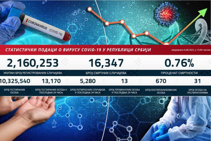 U poslednja 24 sata korona virus je potvrđen kod 5.280 osoba, a od posledica ove bolesti preminulo 13 ljudi.