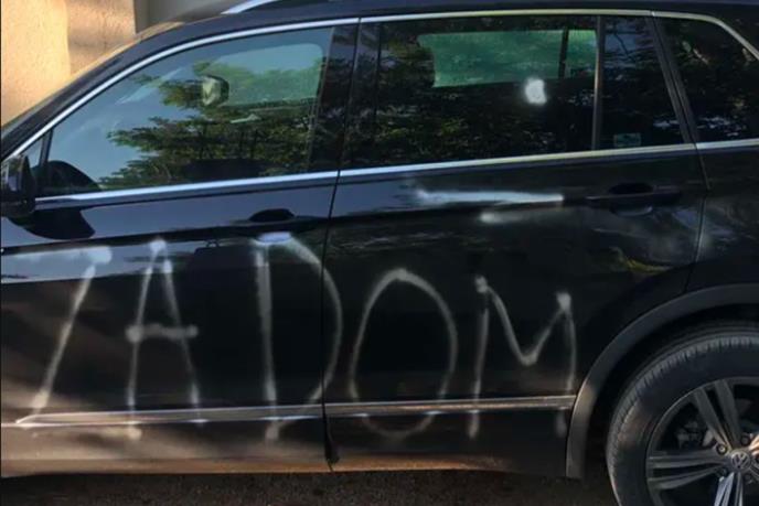 Na automobilu beogradskih registracija, koji su pozajmili od muževog brata, koji je bio parkiran pred njenom porodičnom kućom, zatekli su išarani natpis "Za dom".
