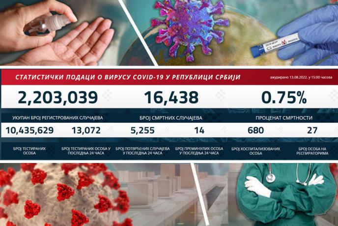 U poseldnja 24 sata korona virus je potvrđen kod 5.255 , dok je od posledica ove bolesti preminulo 14 osoba .