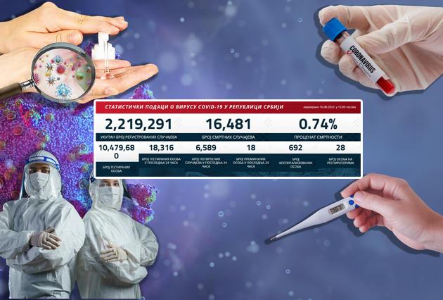 U poslednja 24 sata korona virus u Srbiji potvrđen je kod 6.589 osoba, a od posledica ove bolesti preminulo 18 pacijenata.