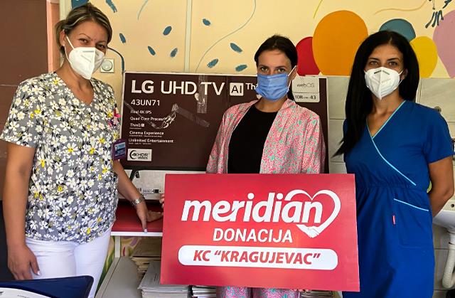 Više od tri godine Meridianbet sprovodi akciju opremanja zdravstvenih ustanova širom Srbije s ciljem lakšeg boravka i bržeg oporavka pacijenata. Tako je Univerzitetski klinički centar Kragujevac, jedna od četiri najvišeg ranga u zemlji, postao i najnovija zdravstvena ustanova kojoj je ova kompanija uručila vrednu isporuku većeg broja HD televizora u cilju povećanja efikasnosti prijema pacijenata.