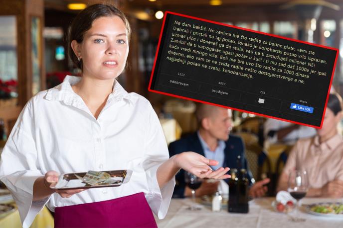 - Ne dam bakšiš. Ne zanima me što radite za bedne plate. Sami ste izabrali i pristali na taj posao. Ionako je konobarski posao vrlo isprazan, uzmeš piće i doneseš ga do stola, vau, pa ti zaslužuješ milione! NE! Zamisli da ti vatrogasac ugasi požar u kući i ti mu sad daš 1.000 evra jer ipak kuća vredi mnogo više. Boli me bre uvo što radite za 1.000 dinara dnevno, ako vam se ne sviđa, radite nešto dostojanstvenije, a ne najjadniji posao na svetu, konobarisanje - napisao je nepoznati korisnik na jednom portalu.