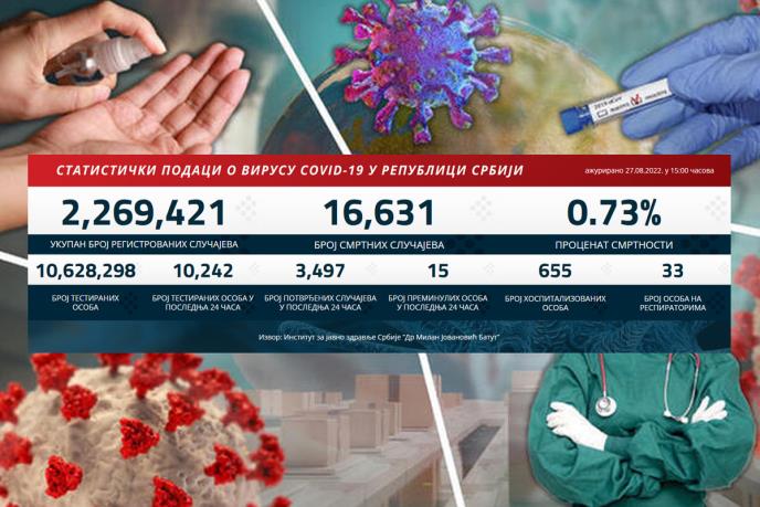 U poslednja 24 sata korona virus je potvrđen kod 3.497 osoba, a istovremeno je od posledica ove bolesti preminulo 15 pacijenata.