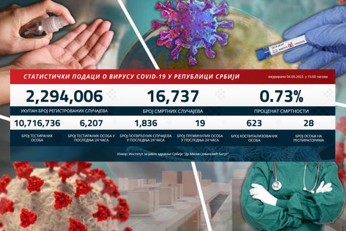Korona virus je u prethodna 24 sata potvrđen kod 1.836 građana od 6.207 testiranih, a istovremeno je od posledica kovida preminulo 19 pacijenata.