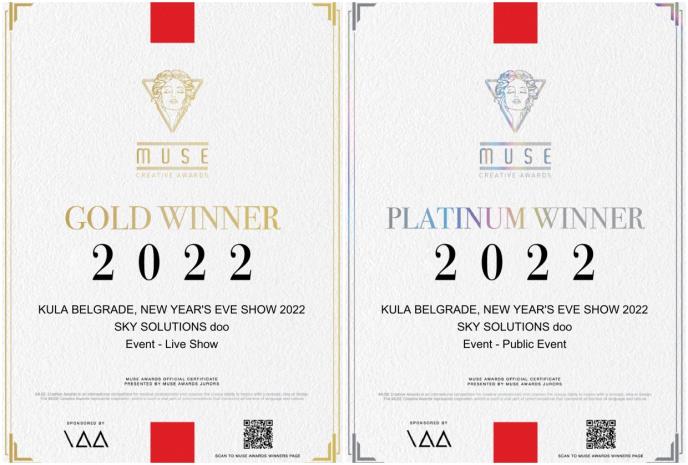 Kompanija SKYMUSIC dobitnik je čak četiri sertifikata MUSE CREATIVE AWARDS međunarodnog udruženja International Awards Associate (IAA), za do sada neviđen performans na Kuli Beograd – New Year’s Eve 2022 multimedijalni laser show, koji je upriličen za doček 2022. godine na Beogradu na vodi.