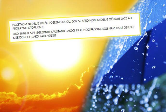 Prema prognozi meteorologa Marka Čubrila, već od petka, odnosno oko 16.septembra stiže nam jako zahlađenje koje će znatno spustiti temperaturu pa će od naredne nedelje, za otprilike 7-8 dana najviša dnevna biti oko 16-17 stepeni?!