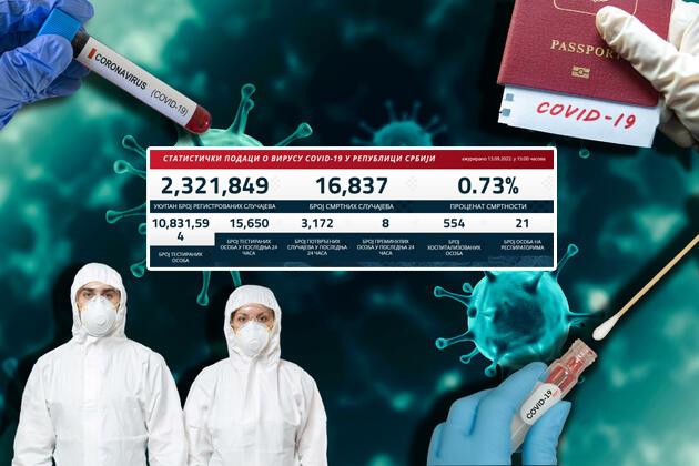 U poslednja 24 sata korona virus je potvrđen kod 3.172 osoba, a istovremeno je od posledica ove bolesti preminulo osam pacijenata.