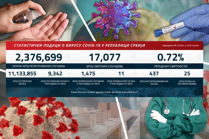 U Srbiji je u poslednja 24 sata registrovano 1.475 novih slučajeva koronavirusa od 9.342 testiranih uzoraka.
