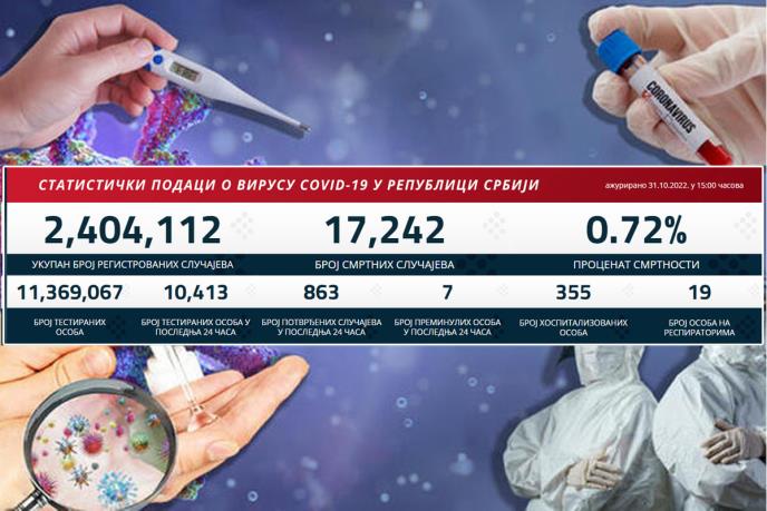 U poslednja 24 sata korona virus je potvrđen kod 863 osobe, a od posledica ove bolesti preminulo je još sedam pacijenata.