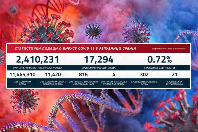 U Srbiji je u poslednja 24 časa zabeleženo 816 novih slučajeva korona virusa, dok je od posledica ovog virusa preminulo četiri pacijenata.