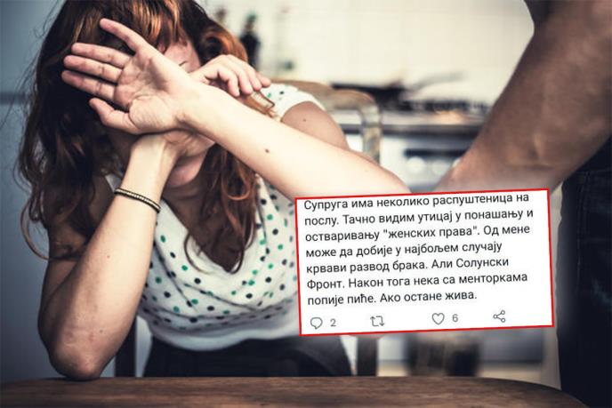 "Supruga ima nekoliko raspuštenica na poslu. Tačno vidim uticaj u ponašanju i ostvarivanju "ženskih prava". Od mene može da dobije u najboljem slučaju krvavi razvod braka. Ali Solunski front. Nakon toga neka sa mentorkama popije piće. Ako ostane živa", glasi sporan tvit koji je, kako uznemirio, tako i naljutio mnoge korisnice ove platforme.