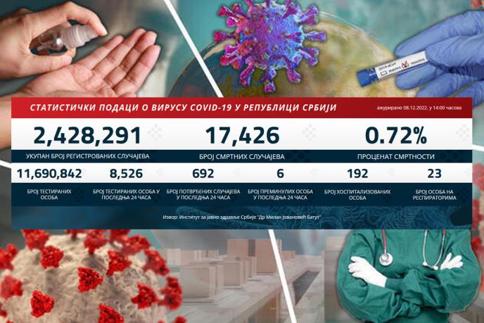 U Srbiji su u poslednja 24 časa registrovana 692 slučaja virusa korona, a šest pacijenata je preminulo, saopštilo je Ministarstvo zdravlja.