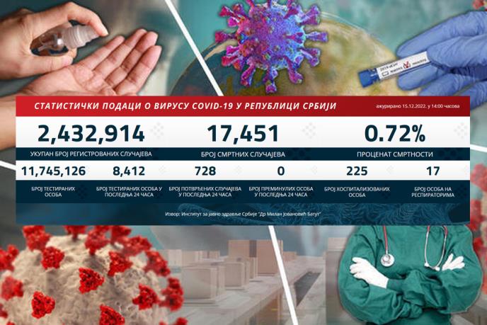 Korona virus je u poslednja 24 sata potvrđen kod 728 osoba, a u poslednja 24 sata nije bilo preminulih.