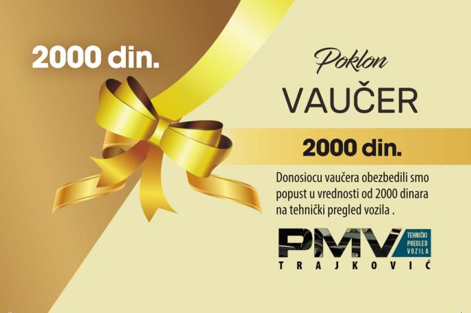 Tehnički pregled vozila ”PMV Trajković doo” na Novom Beogradu omogućio je poklon-vaučer u vrednosti od 2.000 dinara popusta na tehnički pregled vozila.