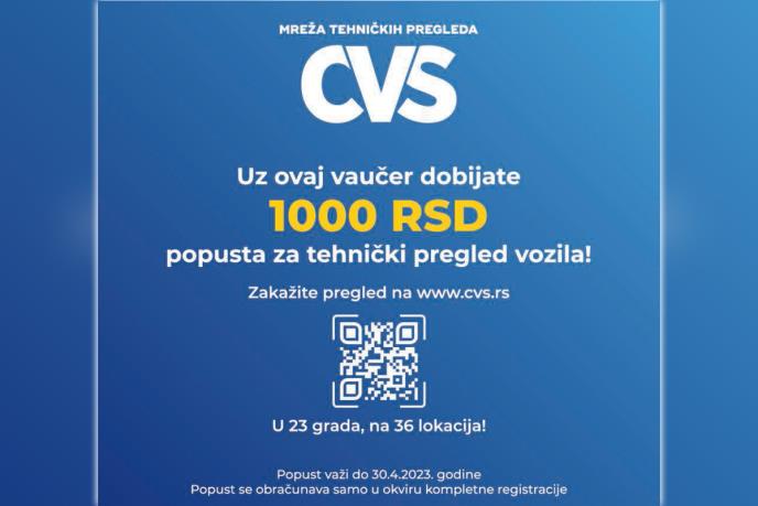 Mreža stanica za tehnički pregled CVS pruža najbolju uslugu tehničkog pregleda, uz dodatnu pažnju kad je najpotrebnija - u najkraćem vremenskom roku na jednom mestu možete obaviti tehnički pregled i produžiti registraciju vašeg vozila bez odlaska u MUP. Tu se posvećenost zaposlenih u CVS prema klijentima ne završava. Osim poklon-vaučera kojim je uz primerak Kurira obezbeđen popust u iznosu od 1.000 dinara na tehnički pregled vozila, svaki čitalac koji obavi celokupnu registraciju u CVS dobija i poklon karticu lojalnosti. S navedenom karticom čitaoci Kurira i korisnici usluga CVS imaju besplatno šlepovanje do 35 evra u Republici Srbiji, popust na gorivo na svim Lukoil pumpama i popuste kod 370 partnera CVS za razne usluge i robu. Akcija Kurira i CVS važi do 30. aprila 2023. godine.
