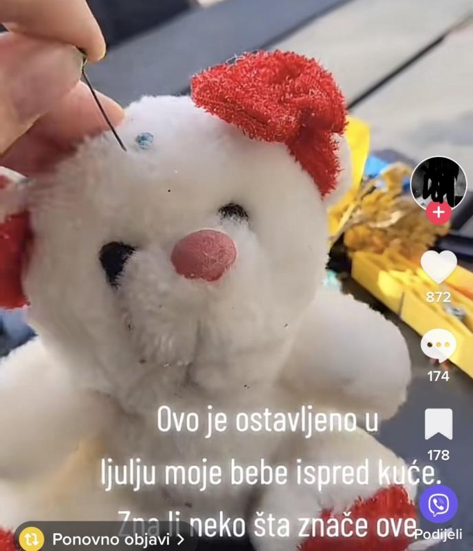Na video snimku ona prikazuje igračku medveda sa ubodenom špenadlom, zihernadlu zakačenu na igračku, ali i druge neke predmete, kao što su brijač, štipaljke, četkicu za zube..