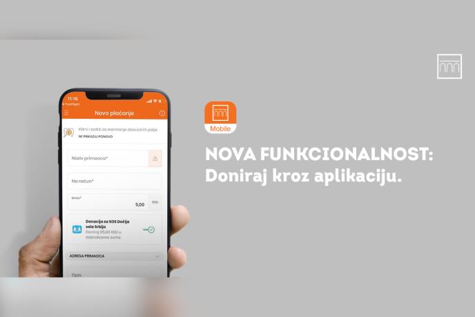 Nova funkcionalnost „Doniraj kroz aplikaciju“ omogućava korisnicima digitalnog bankarstva da, na veoma jednostavan način, ukoliko žele, pruže svoj doprinos i podrže socijalnu inkuziju društveno osetljivih kategorija. Prilikom unosa određenog iznosa u okviru platnog naloga na mobilnoj aplikaciji, korisnicima je automatski ponuđena opcija da doniraju novčana sredstva. Iznos koji se može donirati se zaokružuje na prvu sledeću stotinu, u iznosu do najviše 100 dinara, gde se ta razlika direktno usmerava na račun organizacije SOS Dečija sela Srbija kao donacija. Korisnik može donirati novac neograničeno puta, bez dodatnih troškova.