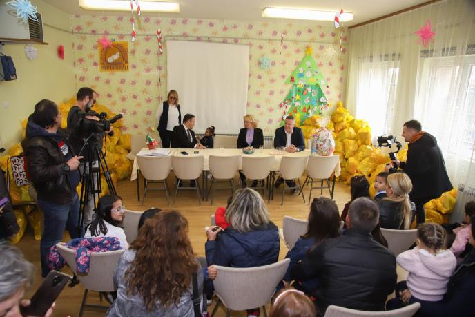 Poklone deci uručila ministarka za brogu o porodici i demografiju Darija Kisic i predatavnici Fondacije Mozzart