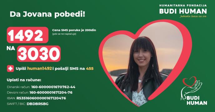 Hitno je u novembru 2022. godine operisana na Klinici za neurohirurgiju u Beogradu, a nakon operacije PH nalaz je pokazao da se se radi o najagresivnijoj vrsti tumora- zloćudnom tumoru slepoočnog režnja mozga (C71.2 Neoplasma malignum cerebri, lobi temporalis). Postoperativno lečenje sprovedeno je na Institutu za onkologiju i radiologiju Srbije zračnom terapijom i hemioterapijom, koje i dalje traju. Da bi se vratila njenoj prvoj ljubavi – violini, kao i njenim đacima, Jovana želi da u toku primanja hemioterapije lečenje nastavi i u klinici na Kubi primenom vakcina jer su mogućnosti daljeg lečenja u Srbiji iscrpljene. Sredstva su potrebna za lečenje u inostranstvu, specijalističke preglede, laboratorijske analize, terapije, operaciju gama nožem, kao i za troškove puta i smeštaja u toku lečenja. Da Jovana pobedi! Budimo humani!