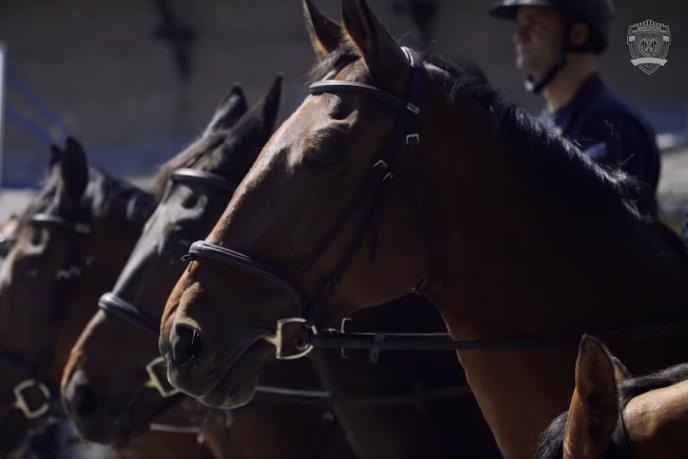 Na snimku se može videti konjica, kao i policajci i policajke.