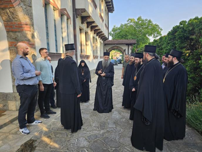 U pratnji Njegove Svetosti nalaze se preosvećena gospoda episkopi marčanski Sava, novobrdski Ilarion, jegarski Nektarije i toplički Petar, kao i visokoprepodobni arhimandrit Danilo, direktor Patrijaršijske upravne kancelarije, i protođakon Radomir Vrućinić, rektor Bogoslovije Svetog Save u Beogradu.