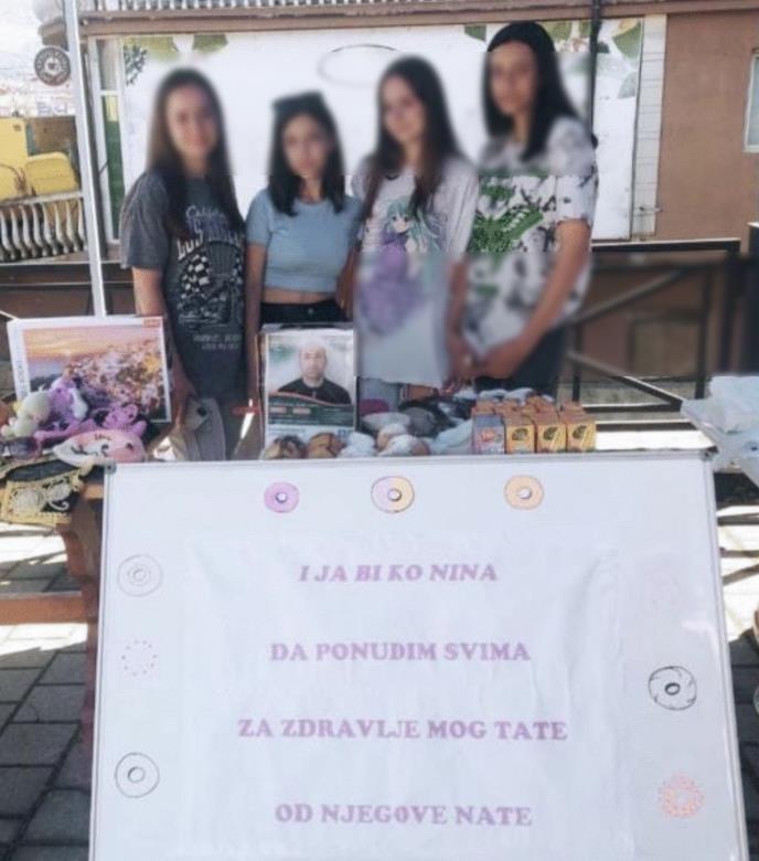 - I ja bih ko Nina da ponudim svima za zdravlje mog tate, od njegove Nate - napisala je ova devojčica na tabli koju je postavila ispred štanda gde se nalaze krofne, sokići, neke igračkice, ali i fotografija njenog oca.