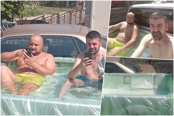Kako gradski bazen u Prokuplju ne radi već dve godine, Stefan Ivanović i Nenad Ilić iz Prokuplja rešili su da ovih tropskih dana rashlade svoje porodice zako što su deo džipa pretvorili u bazen.