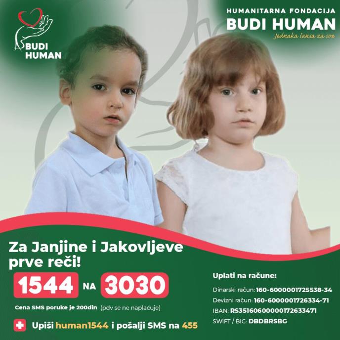 Humanitarna fondacija "Budi human" započela je akciju prikuplja novčanih sredstava za Janju Stankić (8) i Jakova Stankića (5) koja su im potrebna radi lečenja u inostranstvu kako bi oboje mogli da progovore!