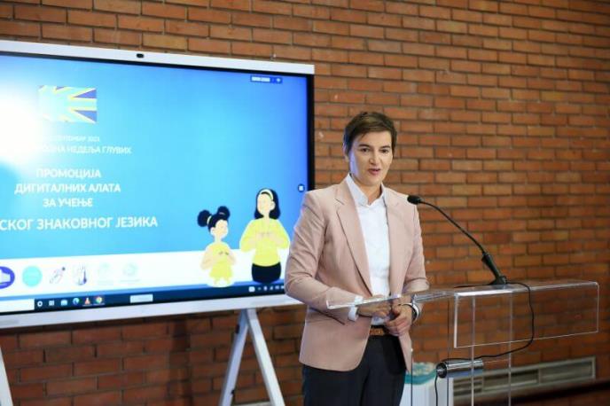 Predsednica Vlade Srbije Ana Brnabić prisustvovala je danas u Dečjem kulturnom centru obeležavanju Međunarodne nedelje gluvih i promociji digitalnih alata za učenje srpskog znakovnog jezika.