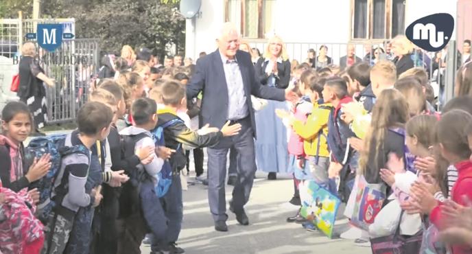 Ispred škole su ga dočekala deca uz gromoglasan aplauz, a mnoga su mu dotrčavala u zagrljaj.