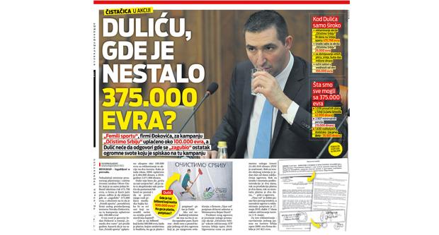 Nekadašnji ministar prostornog planiranja i zaštite životne sredine Oliver Dulić ne želi da otkrije u čijim je džepovima završilo 375.000 evra, koji su misteriozno nestali nakon sklapanja posla s firmom „Njuz vol“ za reklamiranje akcije „Očistimo Srbiju“ na teniskom turniru Srbija open 2009. i 2010. godine u vrednosti od 475.798 evra. Prema rečima Srđana Đokovića, oca našeg proslavljenog tenisera Novaka, na račun njihove firme „Femili sport“ uplaćeno je samo oko 100.000 evra. Ostatak, oko 375.000 evra, po svemu sudeći, ispario je?! Kad je gostovao u emisiji „Utisak nedelje“ na B92, Dulić je pokušao, krajnje nespretno, da se opere, pa je rekao da je ugovorio reklamiranje akcije „Očistimo Srbiju“ na tom turniru za sumu od oko pola miliona evra, po nalogu nekih članova državnog vrha. Međutim, nije želeo da kaže ko su ti „članovi državnog vrha“.
