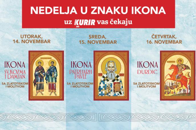 Dnevne novine Kurir vam svaki dan poklanjaju novu ikonu! U utorak, 14.novembra, Sveti Kozma i Damjan, u sredu, 15.novembra, patrijarh Pavle, u četvrtak, 16.novembra, ikona Đurđic.