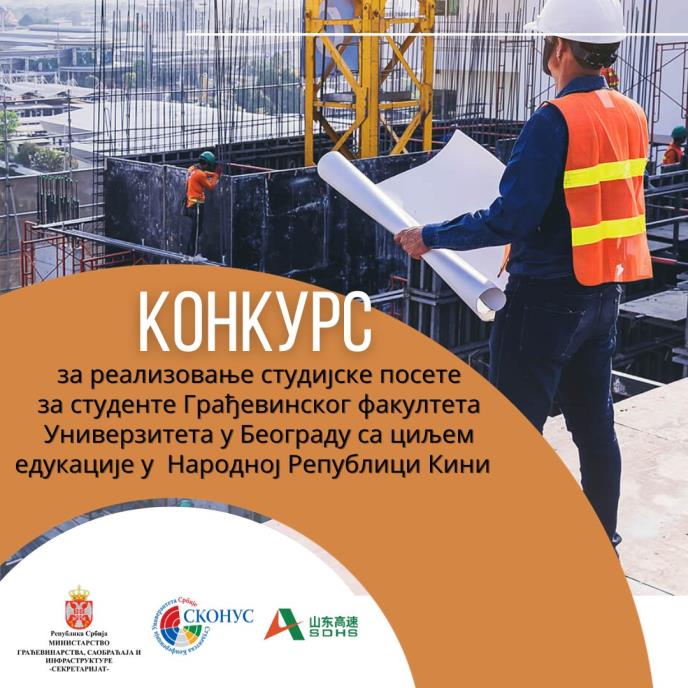 Ministarstvo građevinarstva, saobraćaja i infrastrukture je zajedno sa Studentskom konferencijom univerziteta u Srbiji raspisalo konkurs za deset studenata završne godine i master studija Građevinskog fakulteta Univerziteta u Beogradu sa ciljem edukacije u periodu od 9. do 14. decembra 2023. godine u Narodnoj Republici Kini u provinciji Šangdong.