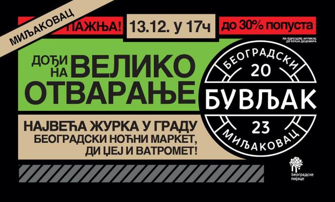 Novi “Beogradski buvljak” biće nezaobilazno mesto za sve one koji traže izuzetnu ponudu i sjajnu atmosferu, gde se može pronaći moderna garderoba, najfiniji tekstil, unikatni nakit, nameštaj, rasveta, kućna galanterija, sve vrste alata i još mnogo toga. Naši zakupci će omogućiti popuste do 30% na određene artikle do kraja decembra.
