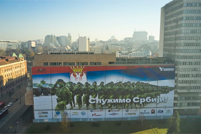Na veličanstvenom baneru impozantnih dimenzija na zgradi Ministarstva odbrane prikazan je stroj pripadnika Vojske Srbije pod punom opremom, kao i zastava Republike koja se vijori nad njima.