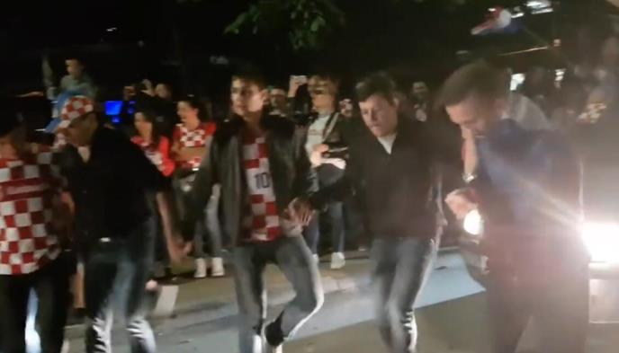 Na snimku se vidi velika grupa mladih koji su ogrnuti hrvatskim zastavama i obučeni u majice sa motivom šahovnice.