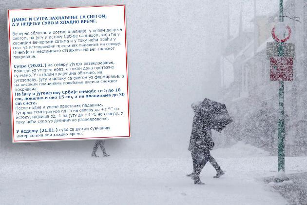 Sutra (20.01.) na severu ujutro razvedravanje, ponegde uz umeren mraz, a tokom dana pretežno sunčano. U ostalim krajevima oblačno, na jugozapadu, jugu i istoku sa snegom uz formiranje, a na visokim planinama povećanje visine snežnog pokrivača.