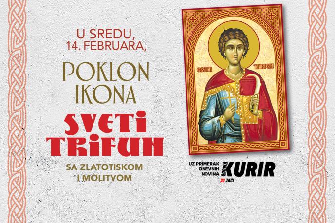 Srpska pravoslavna crkva i svi njeni vernici u sredu, 14.februara, slave Svetog Trifuna, zaštitnika vinogradara, bračne ljubavi i vernosti. Dnevne novineKurir poklanjaju ikonu sa zlatotiskom i molitvom.