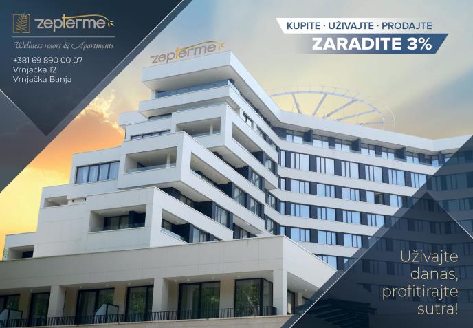 Kraljica banjskog turizma, Vrnjačka Banja, od davnina je poznata po svojim lekovitim izvorima koji privlače posetioce iz celog regiona, a investitor „Zepter Real Estate” doneo je duh svetskih odmarališta upravo u ovu banju! Zepterme kompleks predstavlja moderan koncept na srpskom tržištu – nudi potpuno opremljene luksuzne apartmane, struktura od 35 do 139 kvadratnih metara, koji će promeniti vašu svakodnevicu. U njihovu cenu je uključeno sve što vam je potrebno za beg od gradske vreve i užurbanosti – od nameštaja i rasvete, do bele tehnike i elektronike renomiranih brendova. Na vama je samo da ponesete lične stvari i opustite se.