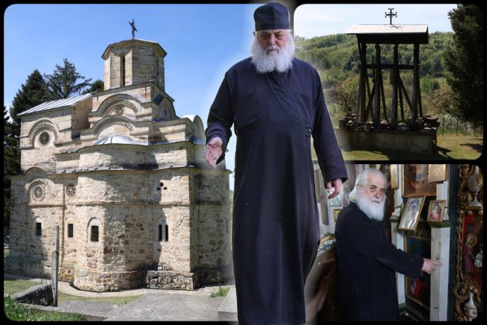 Maločas raskoš, a sada stojimo pred drvenom kapijom. Otvorena je, s leve strane napuštena štala, desno brdo drva, ovde se već spremaju za nadolazeću zimu. Koračamo, udišemo svež vazduh, čuju se melodije ptica iz obližnje šume.. Stižemo do letnjikovca, tu nas čeka iguman manastira otac Damaskin (75), koji ovu svetinju iz 1380. godine čuva već 55 godina.